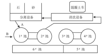 1.混凝土運輸車在清洗設(shè)備處通過抽取4號池的清水洗罐,清洗后漿體由2號池內(nèi)的水作動力沖入分離設(shè)備將砂和石分開,廢水進入1號池;