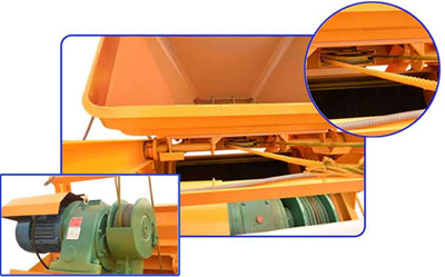 上料時,將需要攪拌的混合物裝在料斗內(nèi),啟動上料系統(tǒng)繩牽引料斗向上爬升,當(dāng)爬升到一定高度時,料斗底部斗門上一對滾輪進(jìn)入上料架,斗門即自動打開,物料經(jīng)漏斗卸入攪拌筒內(nèi)。 |