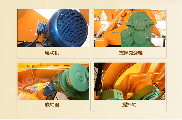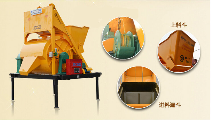 JDC500攪拌機的上料系統由提升機構、上料斗、上料架、進料漏斗等部件構成。