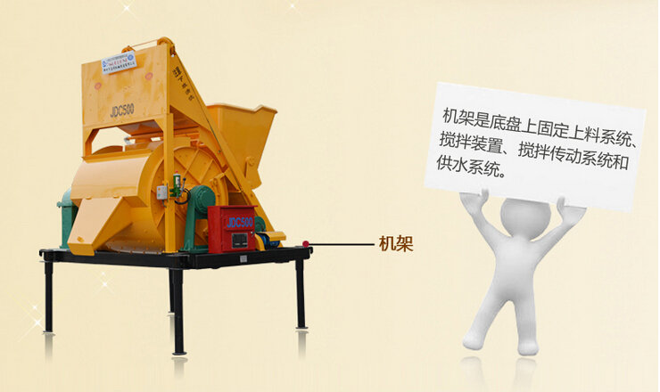 JDC500攪拌機的機架由底盤、支腿、行走輪胎部件構成。